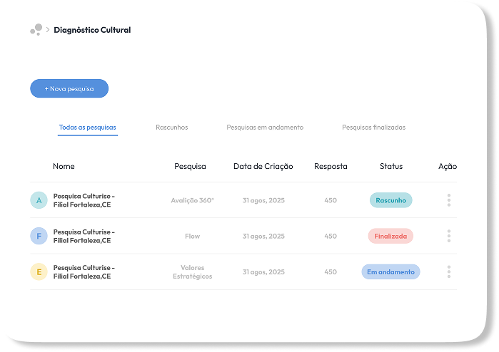Uma plataforma única para entender, acompanhar e aplicar cultura — com profundidade, customização e leitura assistida por IA, sem aumentar a complexidade para RH e liderança